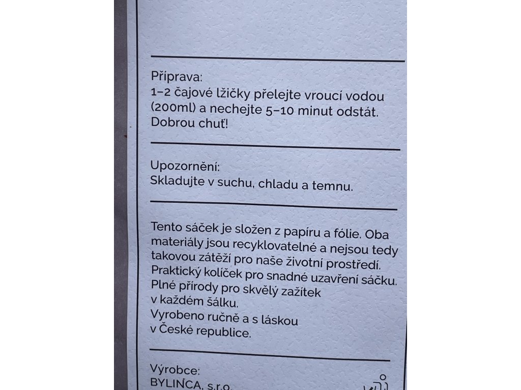 Příprava: 1-2 čajové lžičky přelejte vroucí vodou (200 ml) a nechejte 5-10 minut odstát. Dobrou chuť!