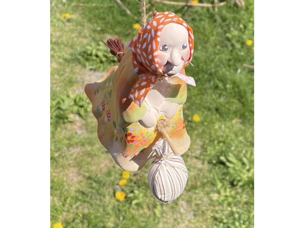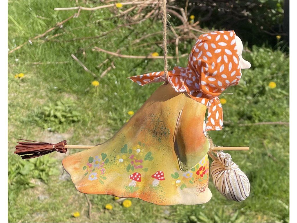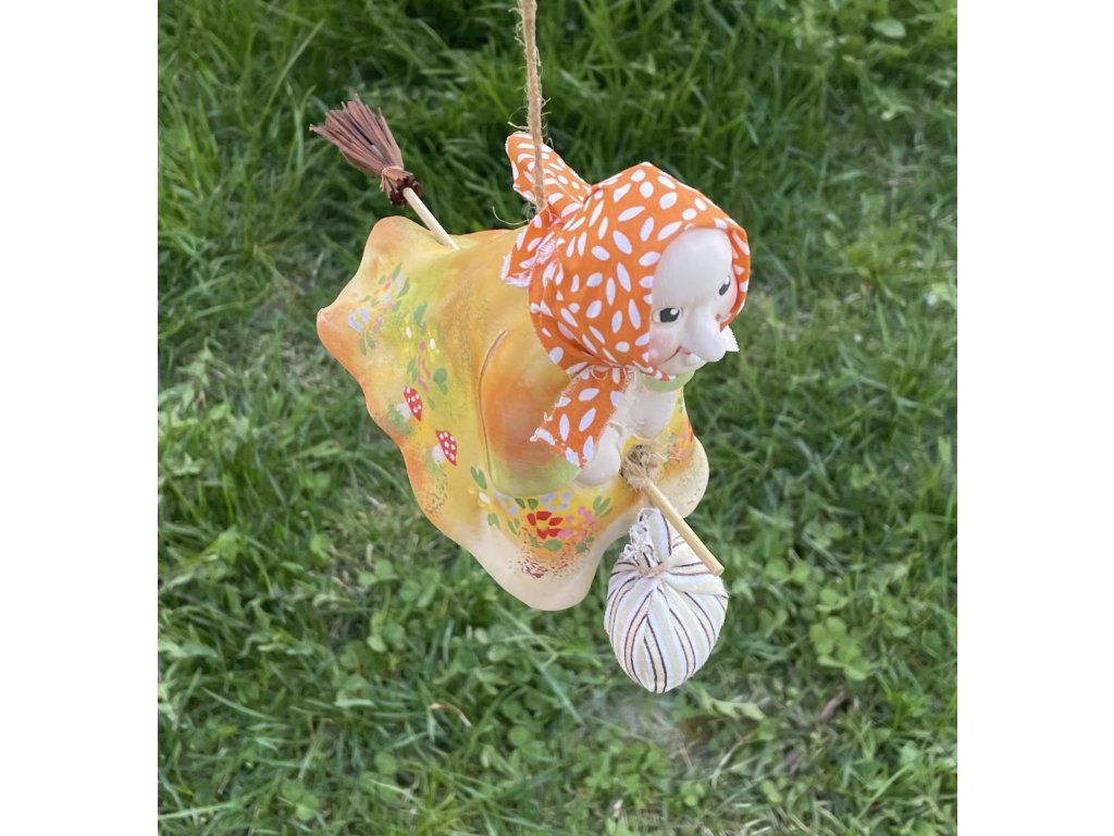 Roztomilá závěsná čarodějnice s látkovým šátkem, pytlíčkem a dřevěným košťátkem přináší kouzlo venkova, pohody a starých dobrých tradic. Jemná keramická dekorace do prostoru, která ozdobí domov, chalupu i zahradní zákoutí.