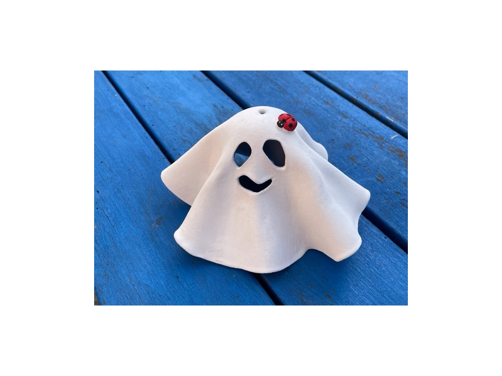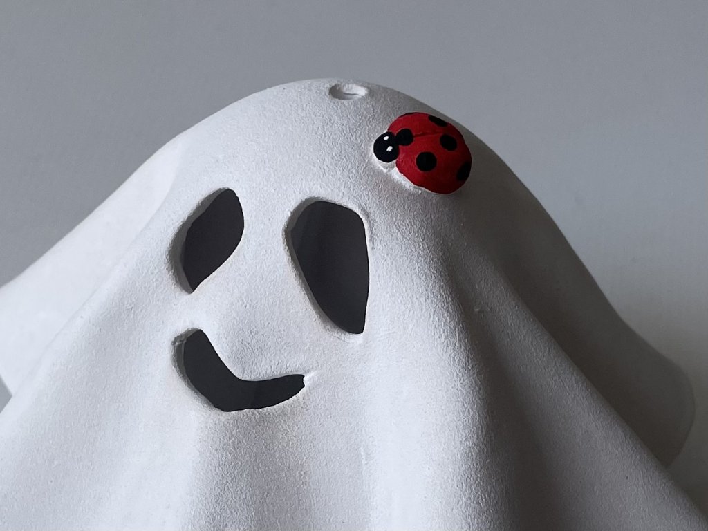 Keramický svícen duch ( +/-9 cm) takový malý Buclíček zdobený beruškou, která mu dává roztomilost.