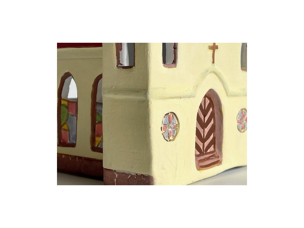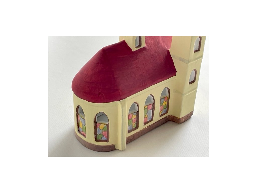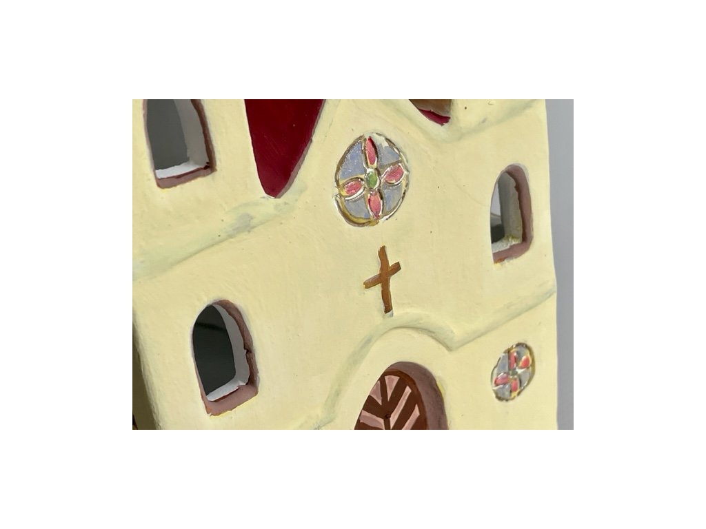 Keramický kostel na svíčku s vyřezávanými okny v klasické barevnosti. Velikost kostela je přibližně 19,5 x 11 x 16,5 cm.