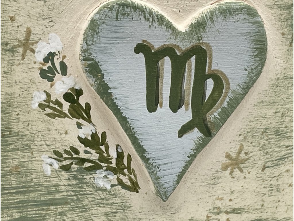 Na jedné straně domečku je symbol znamení Panny v srdci – znamení péče, čistoty úmyslů a vnitřního řádu. Na druhé straně najdete jemnou ženskou tvář, která dodává domečku osobitost, hloubku a klidnou energii. Ve předu vedle srdíčka je takový detail kresba tymiánu.