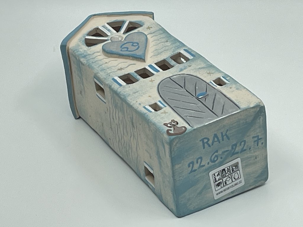 Modrobílé tóny evokují vodní živel, jemnost a hloubku citu. Reliéfní srdce na čelní straně symbolizuje otevřenost a péči, typickou právě pro Raky. Na boční stěně se objevuje jemný motiv raka, ochránce a strážce domova. Každý detail je ručně malovaný, každý domeček je originál.