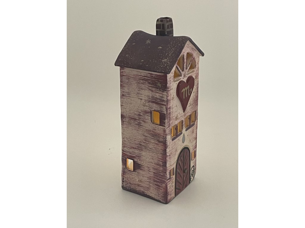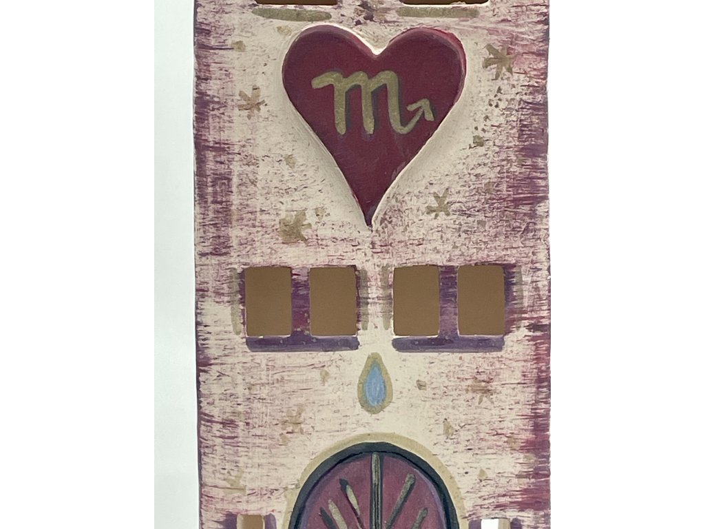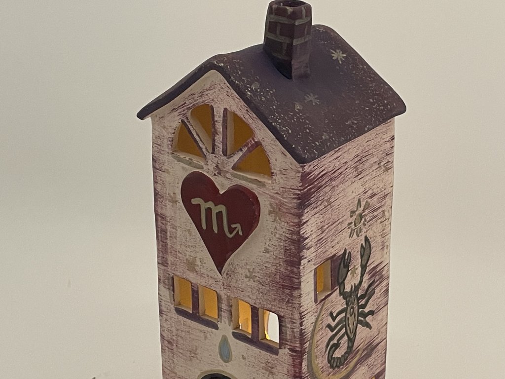 Keramický domeček pro znamení Štíra – tajemný, ochranitelský a plný vnitřního světla. Když zapálíte svíčku, rozsvítí se nejen okna, ale i atmosféra domova. Dekorace vysoká +/- 19 cm.