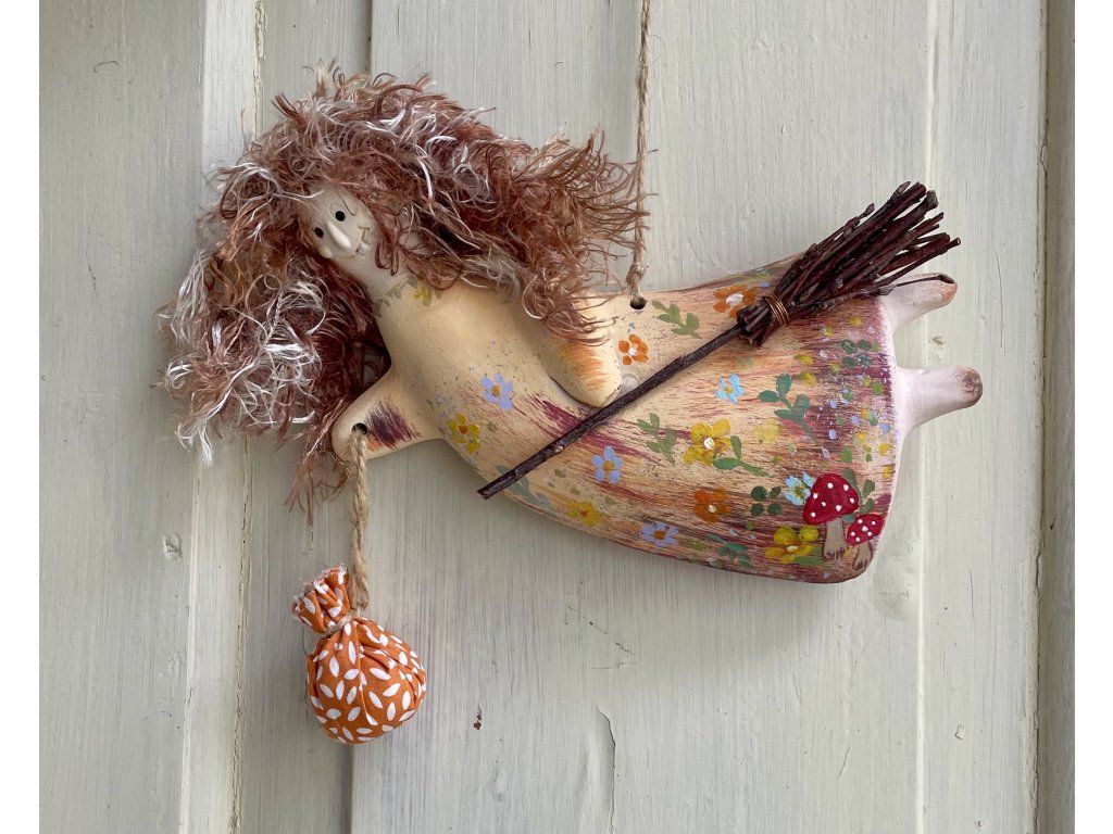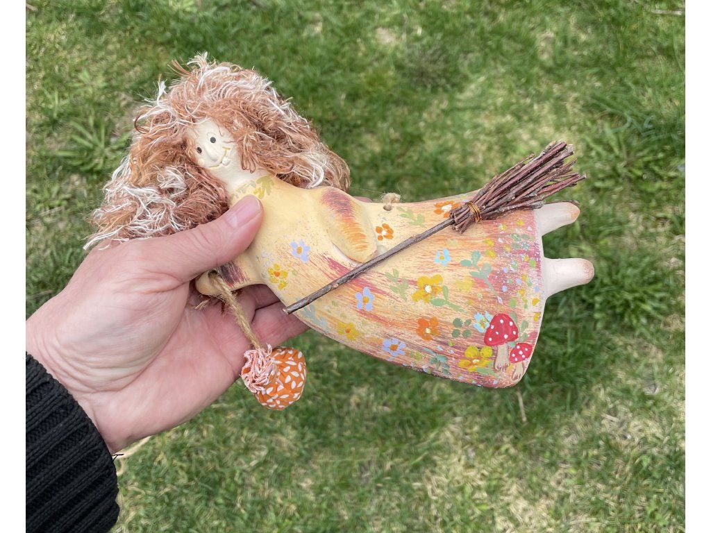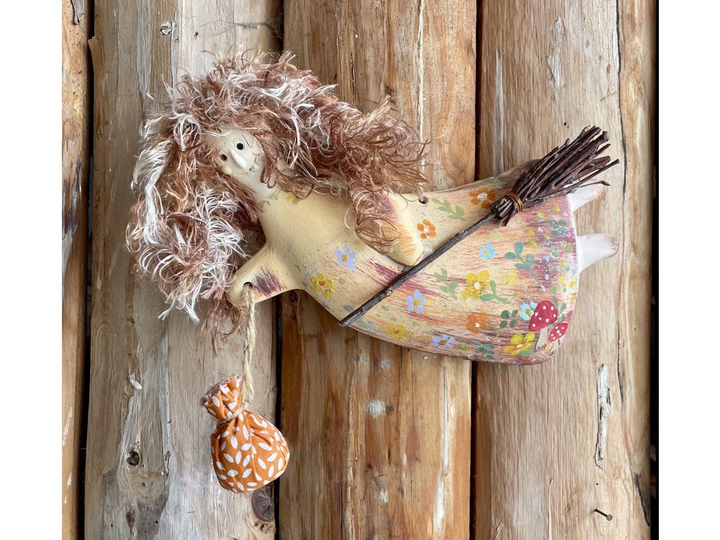 Ručně malovaná strážkyně domova, která vás okouzlí detaily: rozkvetlou loukou na šatech, červenými muchomůrkami a věrným koštětem. Každý steh na jejím měšci a každý tah štětcem je výsledkem poctivé ruční práce. Vneste do svého interiéru kousek lesní magie a hřejivou atmosféru podzimu.