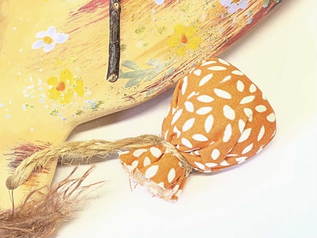 Hledáte dekoraci, která má duši? Flora není z továrny. Je to autorský kousek, který prošel rukama výtvarníka od prvního nákresu až po poslední uzlík. Její oranžovo-žlutý háv zdobí ručně malované kytičky a veselé muchomůrky, které z ní dělají neobyčejnou ozdobu pro každé roční období.