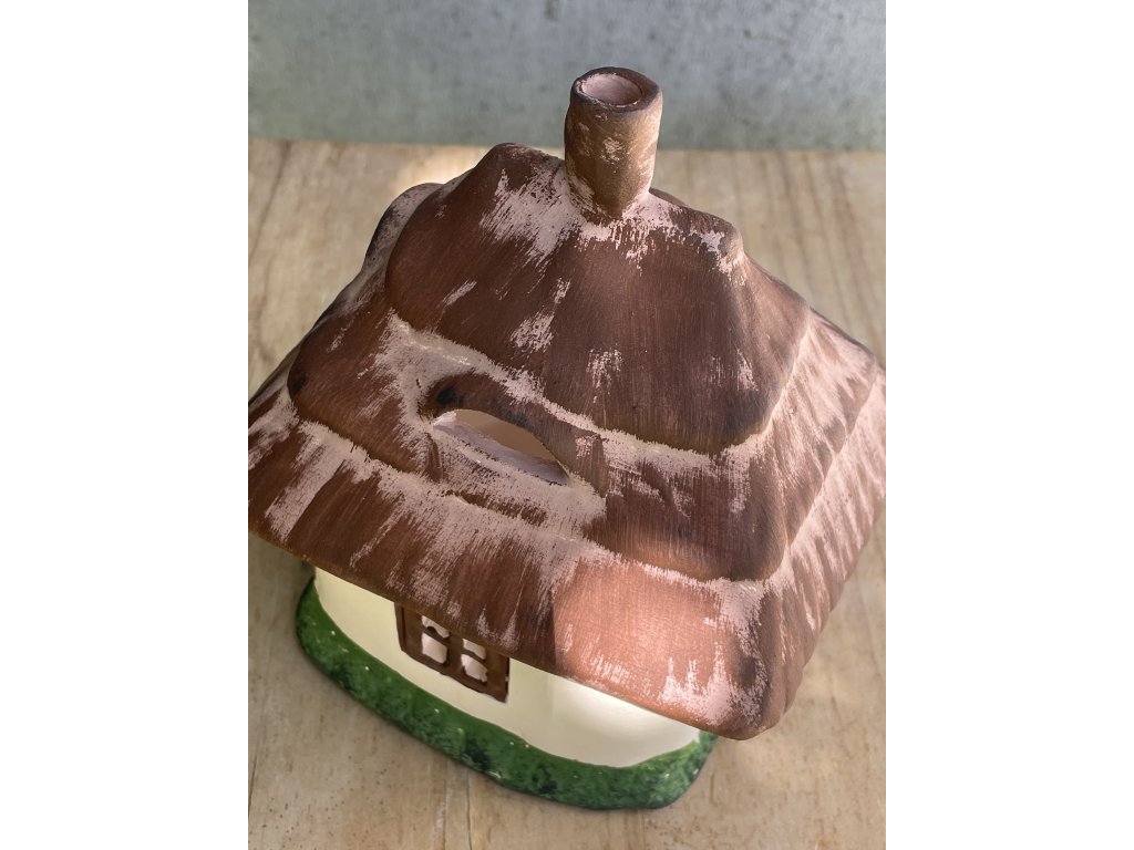 Keramický domeček jako svícen na čajovou svíčku pro příjemnou romantickou atmosféru ve větší velikosti se 4 okénky a vyřezávaným štítem. Otvor na svíčku je vzadu. Svícínek má výšku cca 18 cm.
