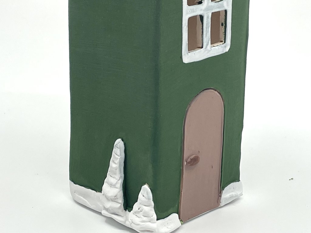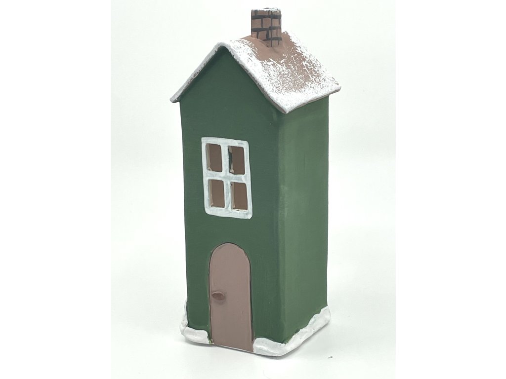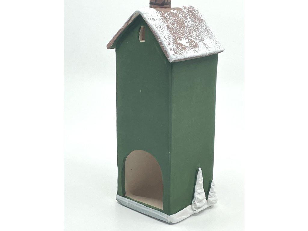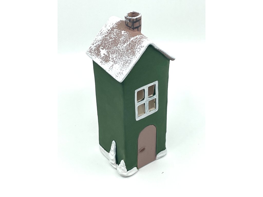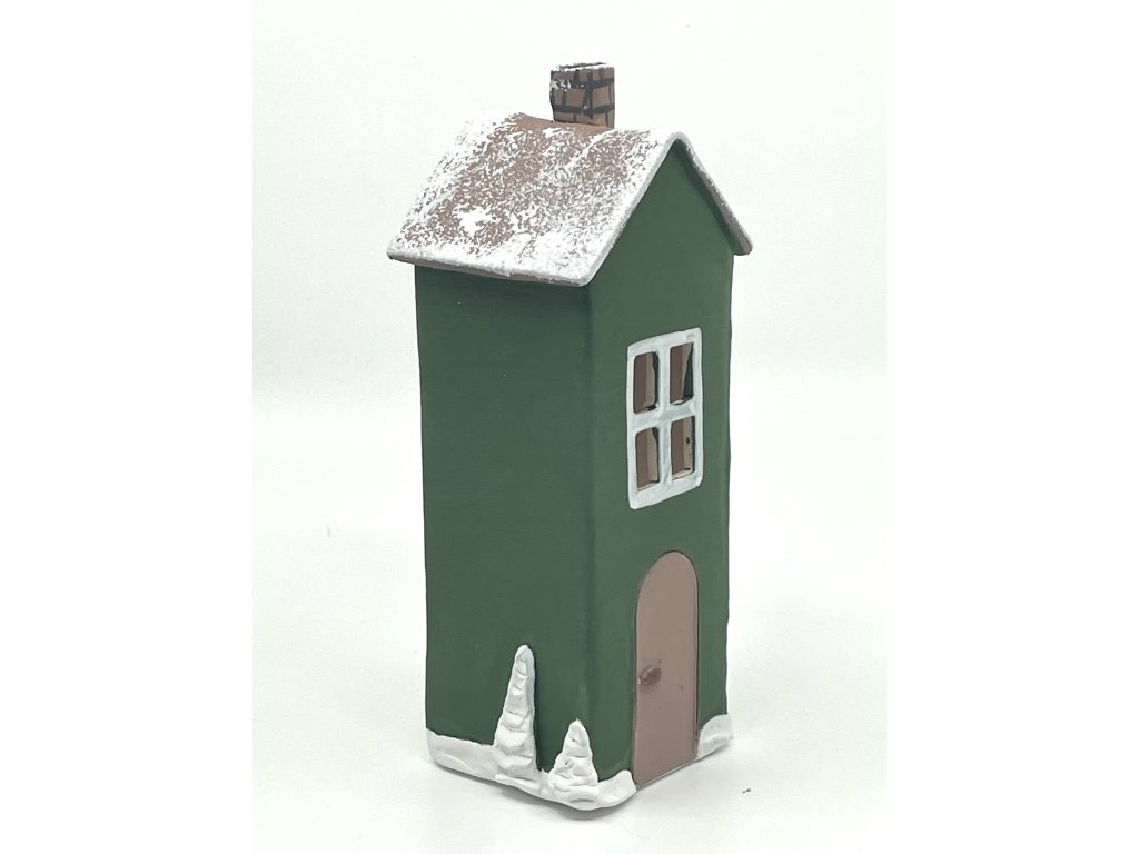 Keramický domeček jako svícen na elektrickou čajovou svíčku pro příjemnou zimní atmosféru.. Otvor na svíčku je vzadu a na střeše je komínek pro odchod tepla. Domek vyniká mnoha detaily, které mu dodávají kouzlo. Svícínek má výšku 16,5 cm.