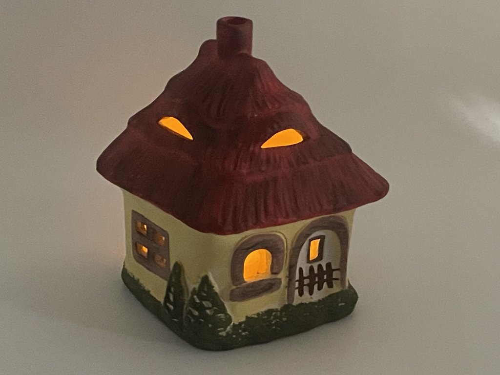 Kouzelná propracovaná chaloupka s vyřezávanými okny ve stěnách a ve stříšce, kterými prochází světlo svíčky. Zezadu má chaloupka otvor na vkládání svíčky.