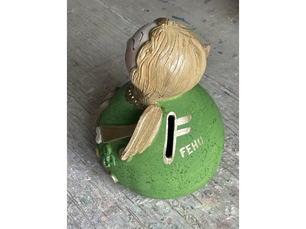 Keramická kasička v podobě roztomilé andělky Zlatěnky, která přináší hojnost, štěstí i úsměv. Na zádech ukrývá tajemství – runu Fehu, symbol bohatství a nových začátků. Výška +/-19 cm.