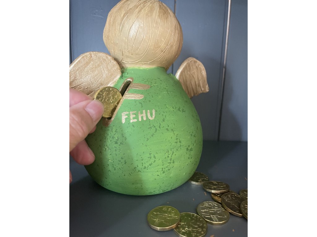 Runa Fehu je prvním znakem germánského futharku a od pradávna symbolizuje bohatství, hojnost, plodnost a nový začátek. Její přítomnost na této kasičce přináší pozitivní energii do finančních záležitostí i života obecně.