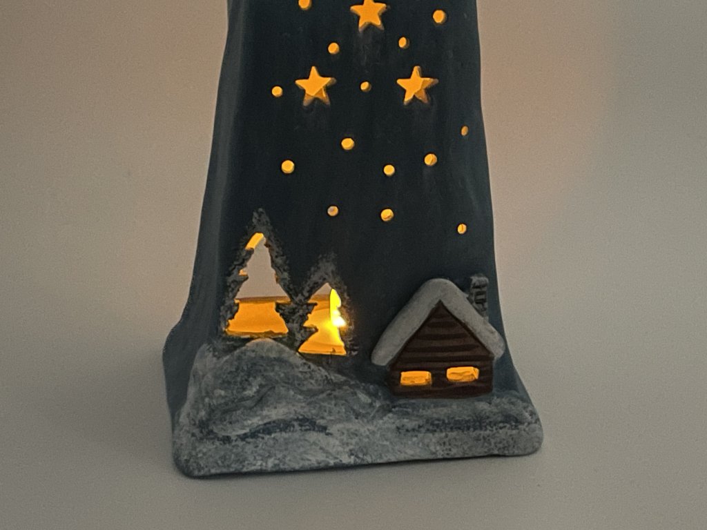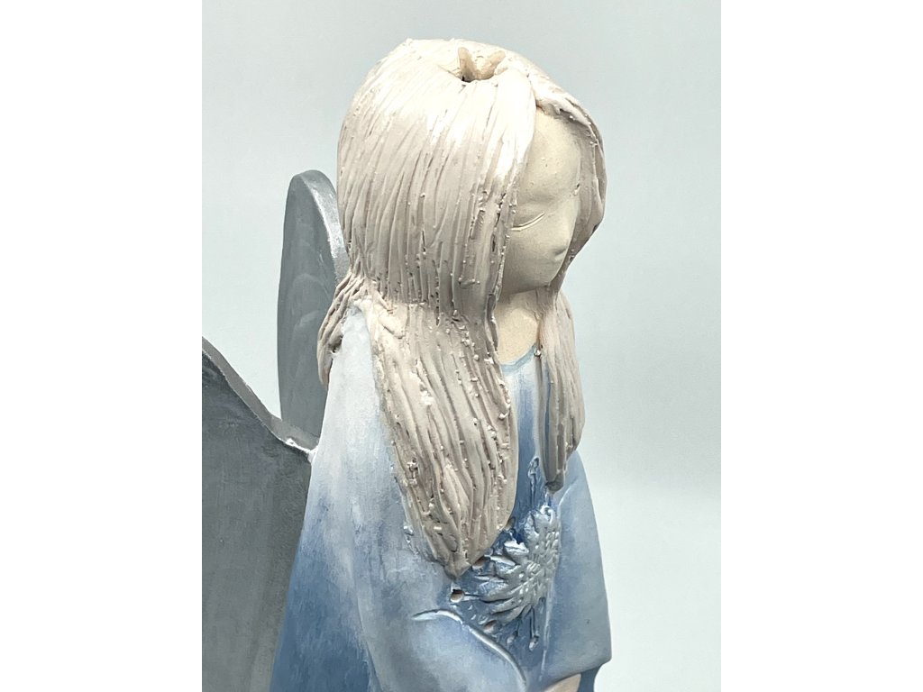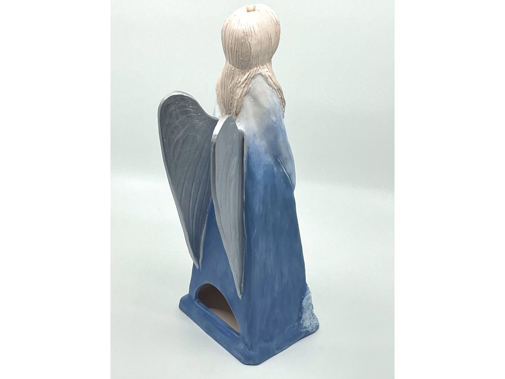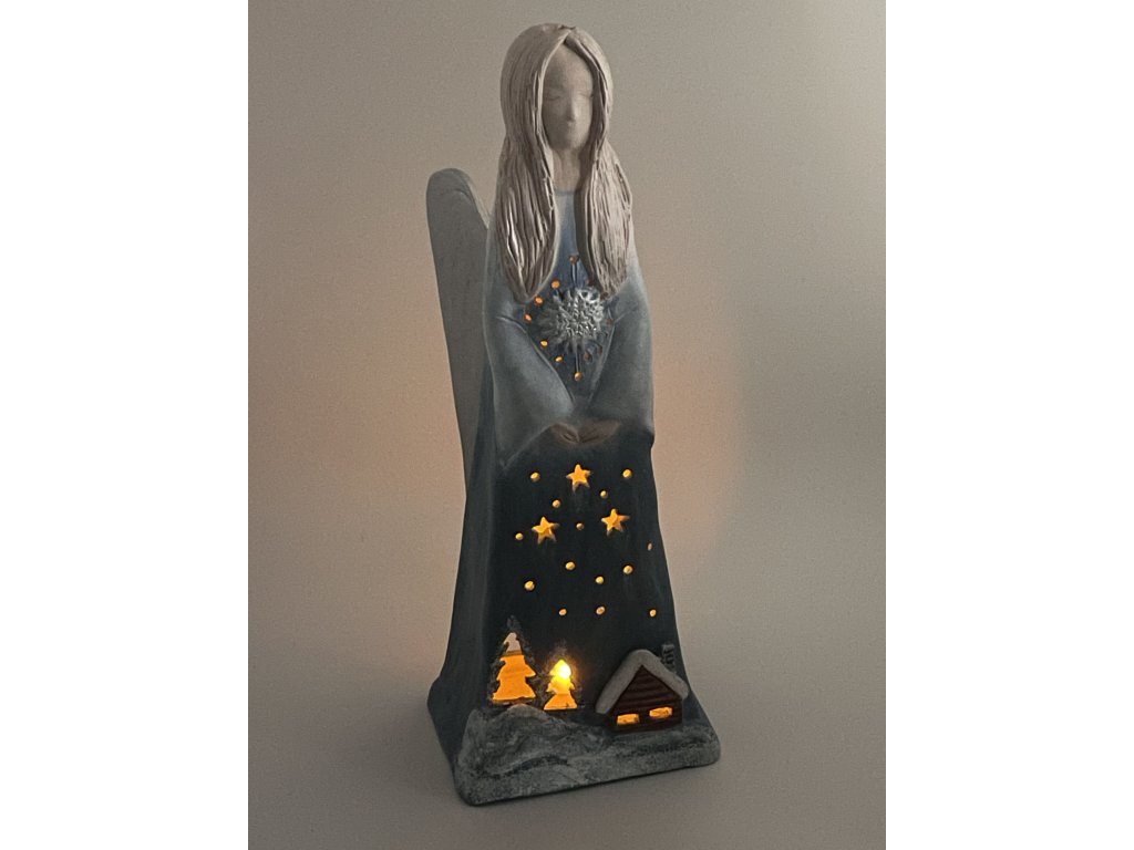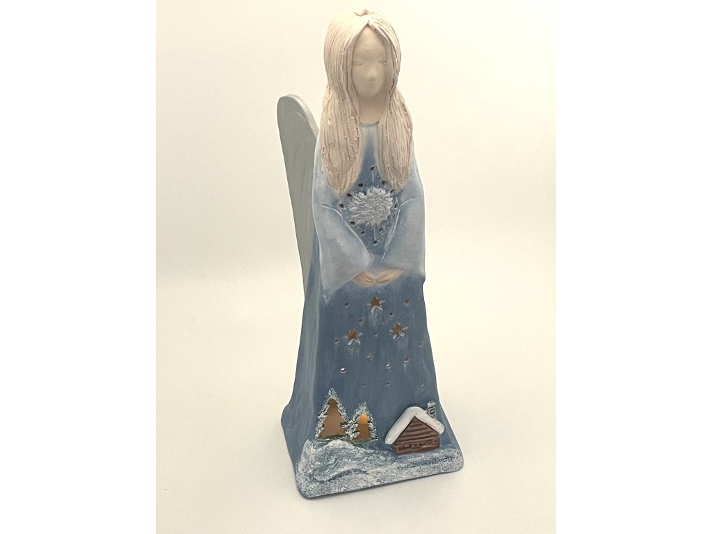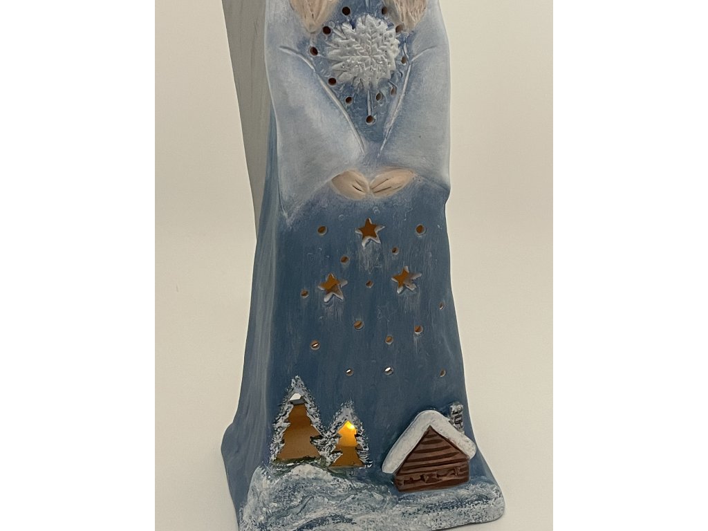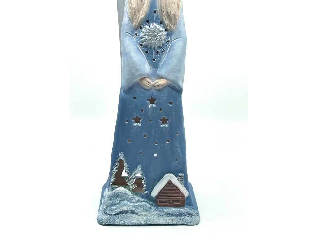 Výrazná keramická dekorace na svíčku vysoká 36 cm, ručně malovaný anděl v jemných zimních tónech. Symbol ticha, klidu a ochrany domova.