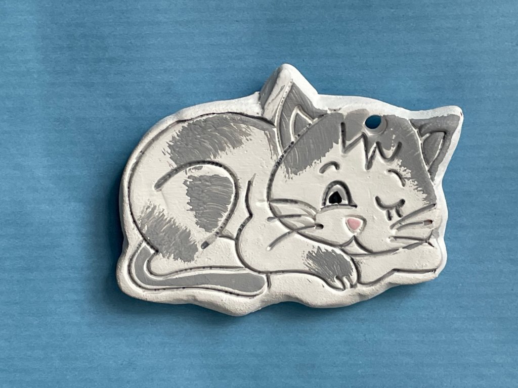 Magnetická dekorace z keramiky kočka v barevném bílošedém provedením,