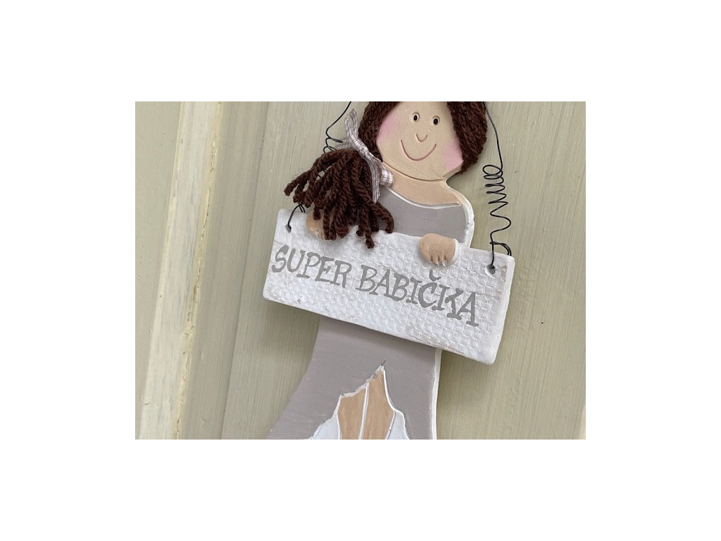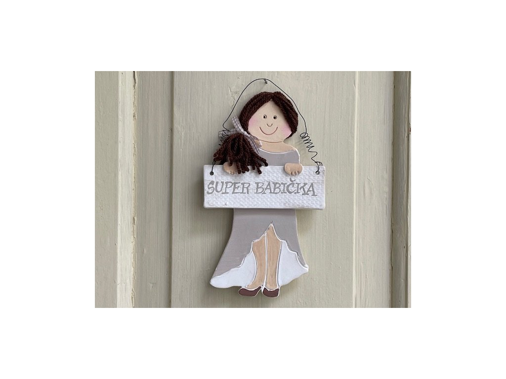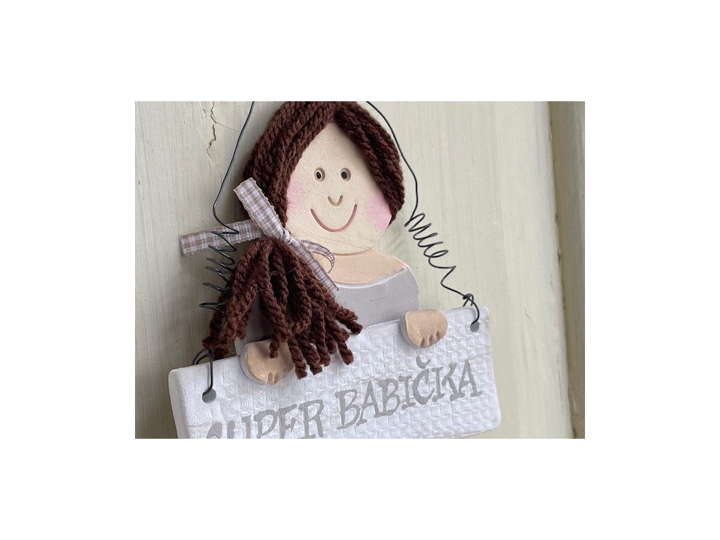 Keramická dekorace na zeď, zobrazující stylovou babičku v cappuccinových šatech, držící s láskou cedulku s nápisem "Super Babička" a nebo "Nelepší babička". Tato jedinečná dekorace přináší do vašeho prostoru dotek lásky. Dekorace měří na výšku 21 cm.