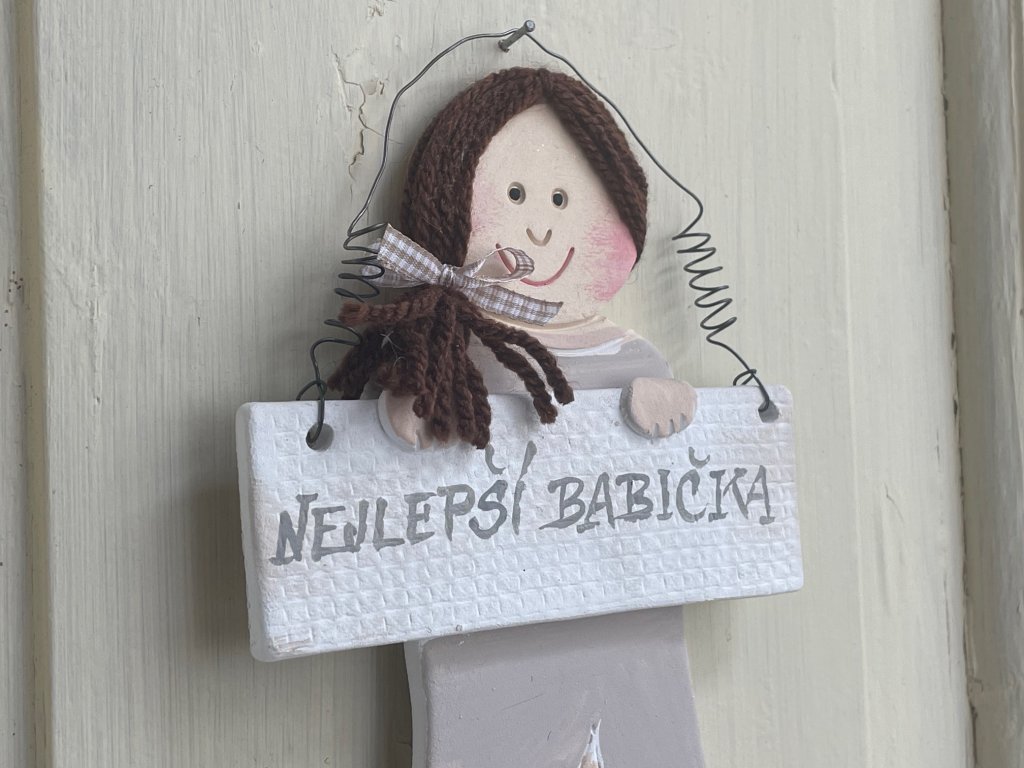 Roztomilá dekorace babička s cedulkou je také krásný dárek pro babičky.