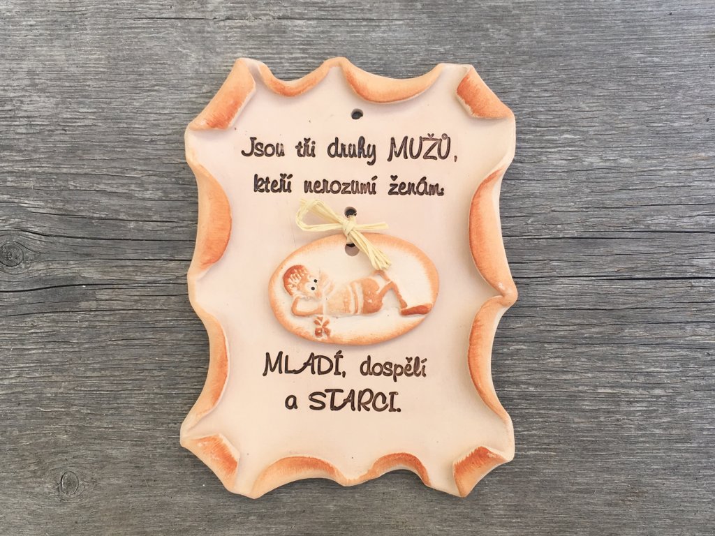 Keramická dárková cedulka pergamen s vtipným nápisem: Jsou tři druhy mužů, kteří nerozumí ženám: mladí, dospělí a starci.