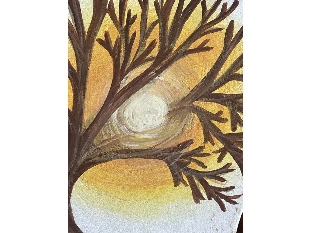 - Slunce/Světlo: Zlatavý střed malby znázorňuje životodárnou energii, optimismus a teplo domova, které prozařuje i ty nejsložitější „větve“ našeho života.