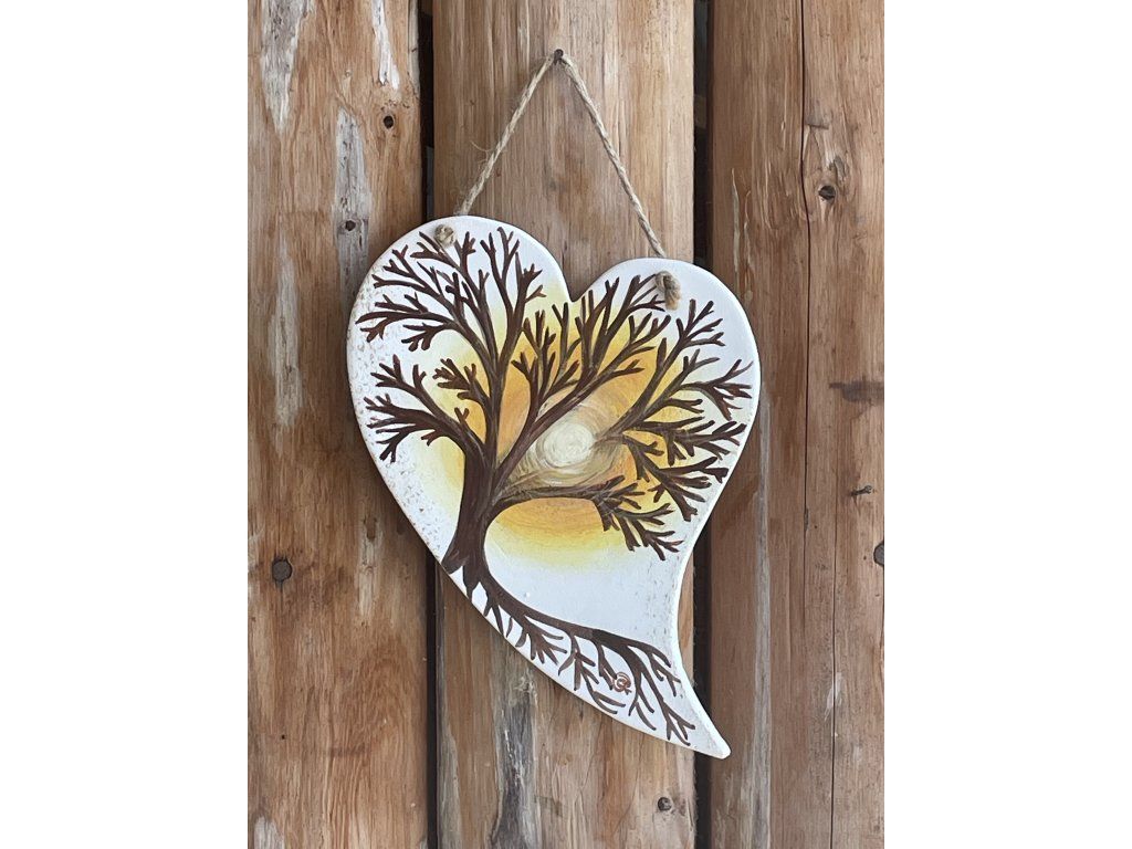 Toto ručně modelované srdce není jen ozdobou, ale nositelem silných významů. Malba zachycuje košatý strom v hřejivé auře zapadajícího nebo vycházejícího slunce, což vytváří atmosféru klidu a naděje.