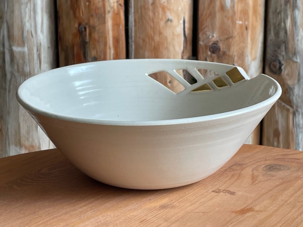 Mísa má vyřezávané detaily, které vytváří zajímavý detail. Tyto vykrajované motivy zdobeny zlatými akcenty, které vynikají proti béžovému podkladu. Zlaté detaily dodávají misce luxusní a sofistikovaný vzhled, zatímco celkový design zůstává jemný a harmonický, ideální pro moderní i tradiční interiéry. Tato dekorační miska je nejen praktickým doplňkem, ale také uměleckým dílem, které přitahuje pozornost.