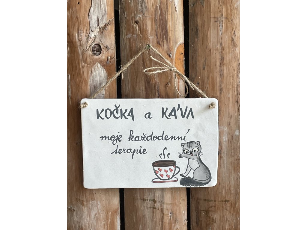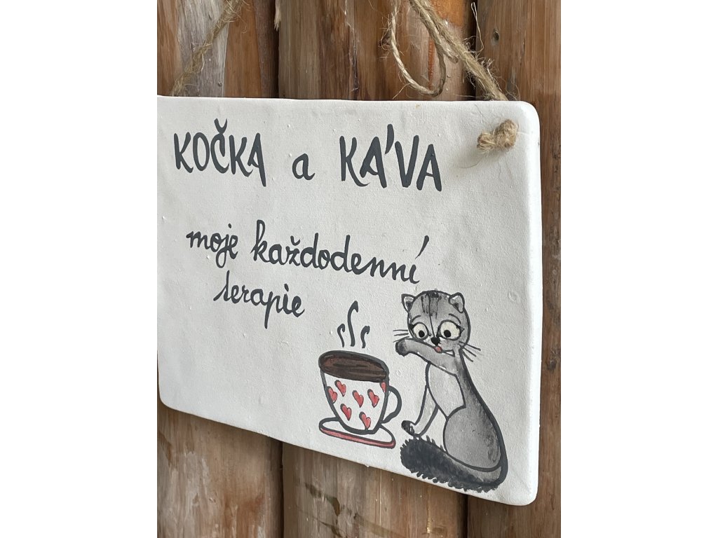 Kočičí cedulka „Kočka a káva“ je stylová keramická dekorace ručně vyrobená rodinnou značkou Keramika Andreas® ve městě Votice (Střední Čechy). Jedná se o nástěnnou cedulku o tloušťce cca 5 mm a rozměrech přibližně 13 × 19 cm, opatřenou provázkem k pohodlnému zavěšení