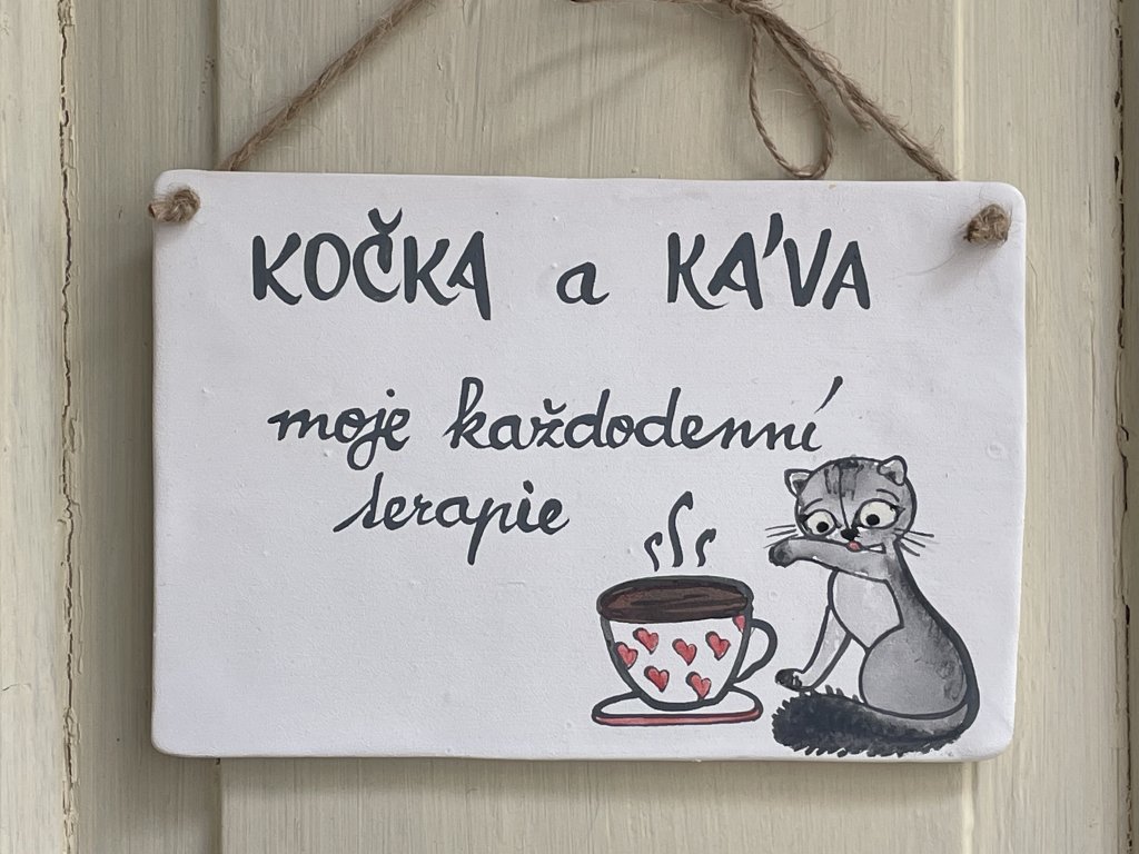 Keramická cedulka s nápisem slouží k pověšení na zeď. Pro milovníky koček a kávy.