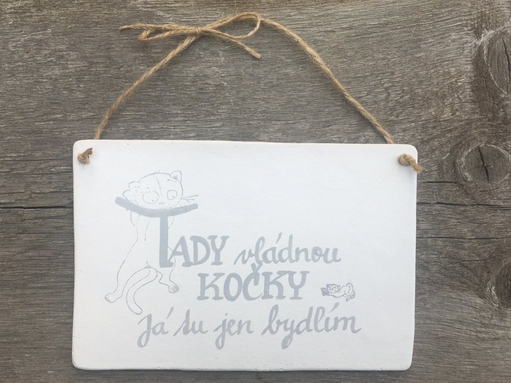 Přiznejme si to, kdo doma vládne? Cedulka „Tady vládnou kočky, já tu jen bydlím“ řekne vše. Každý, kdo někdy choval kočku (nebo byl chován kočkou? :D), jistě souhlasí :) Máme i variantu „Tady vládne kočka, já tu jen bydlím“, pro případ, že máte kočku jen jednu.