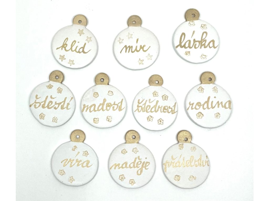 Co je pro vás kouzlo Vánoc? Unikátní sadu vánočních ozdob se slovy, které pro vás Vánoce vystihují. Prostě vaše kouzlo Vánoc. Tyto drobné jemné keramické ozdoby jsou v bílo-zlatém provedení s ručně psaným textem. Velikost jedné ozdoby je asi 4,3 mm. Cena je za sadu 10 kusů ozdob.