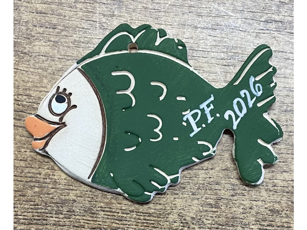 Malý keramický kapřík jako "péefko" (novoročenka) pro štěstí do nového roku s nápisem PF 2026. Velikost rybičky 7,5 cm.