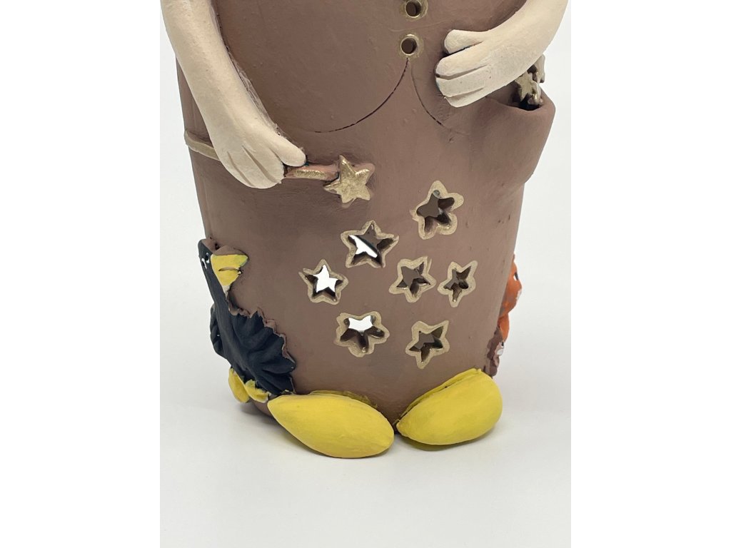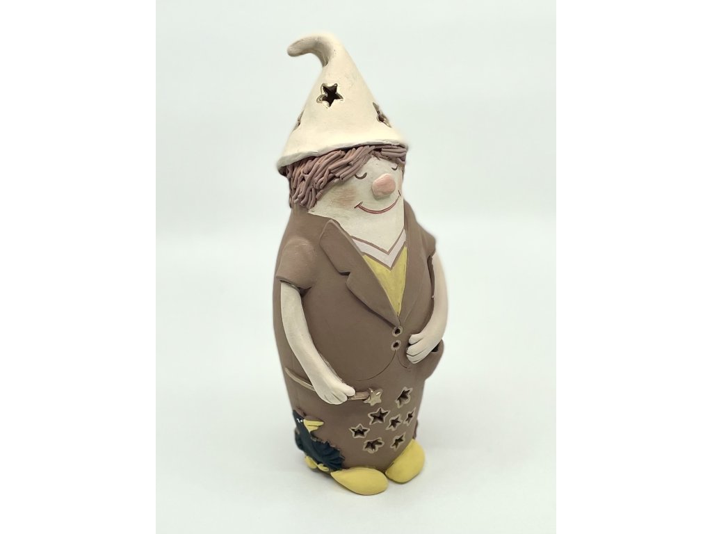 Seznamte se s neposedným skřítkem Eliáškem – kouzelnou dekorací, která rozzáří váš domov. Tento ručně vyráběný keramický skřítek je laděný v přírodních odstínech hnědé a béžové, s typickou špičatou čepicí s hvězdičkami, žlutými střevíčky a drobným kouzelnickým proutkem v ruce.