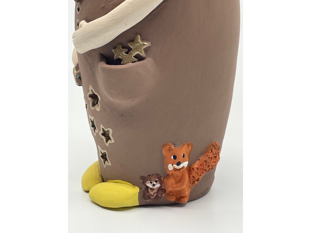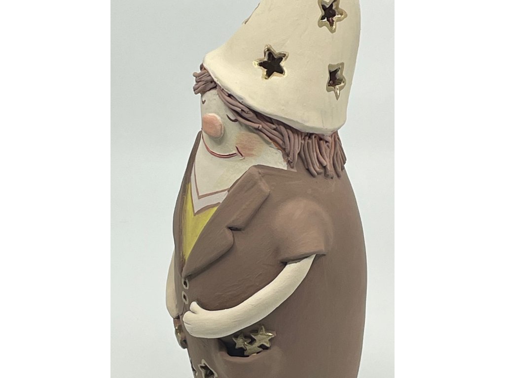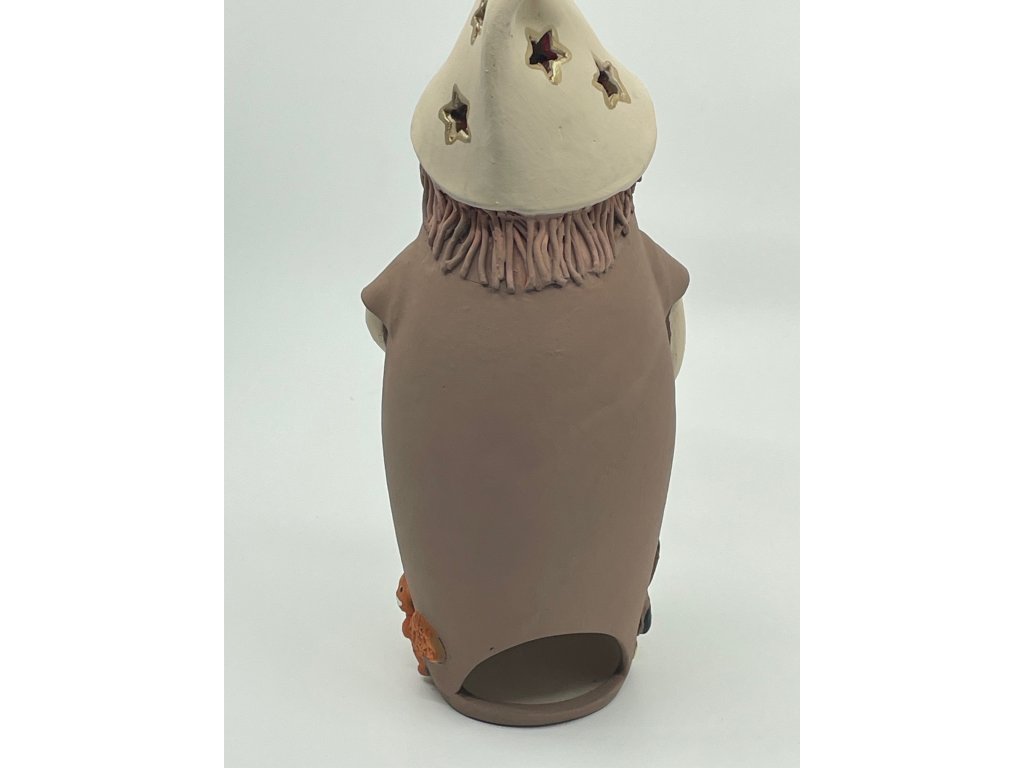 Přírodní neposedný skřítek Eliášek – originální keramická dekorace na svíčku s kouzelnou atmosférou. Dekorace určená na svíčku, z bezpečnostního hlediska doporučujeme elektrické napodobeniny svíček. Velikost sošky skřítka je +/- 23 cm