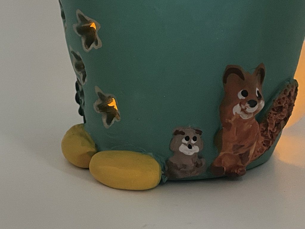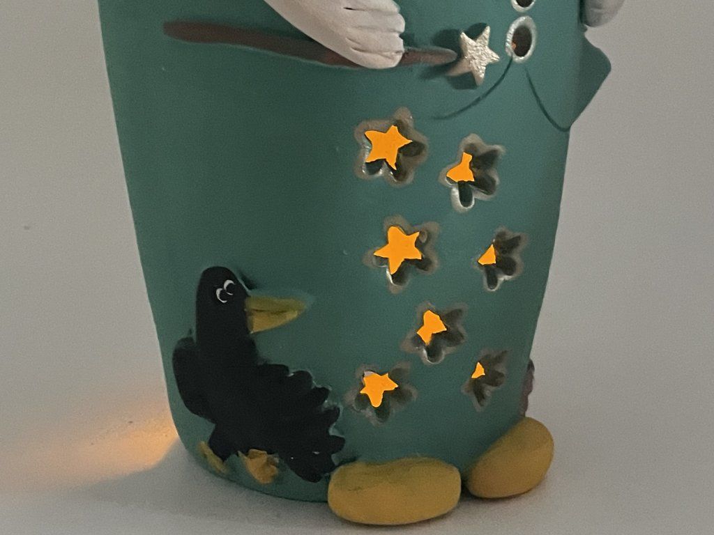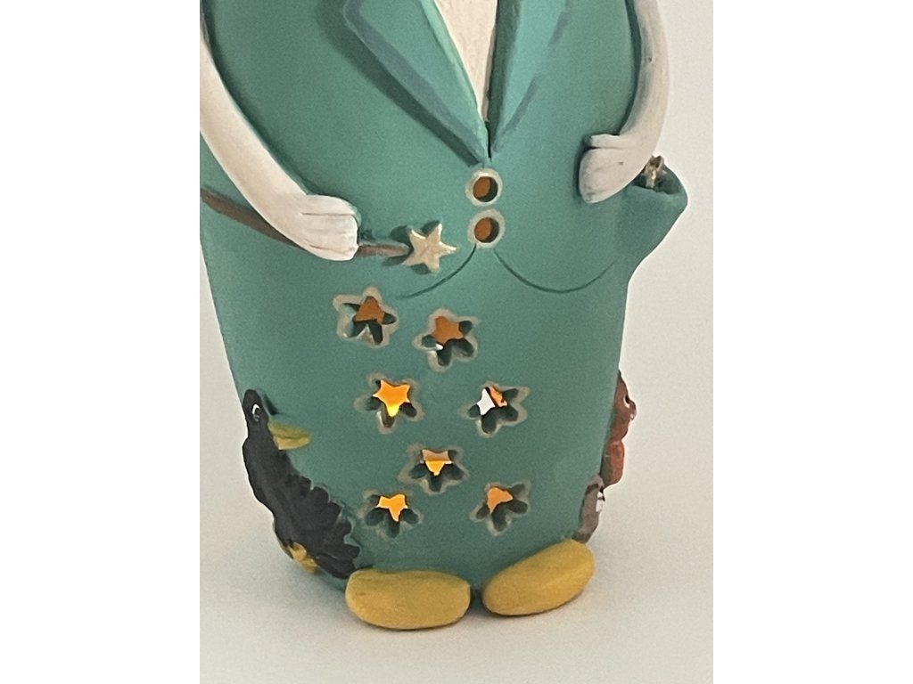 Postavička je ručně vyráběná z keramiky, s veselými barevnými detaily (veverka, ptáček, kouzelná hůlka) a drobnými otvory, kterými může prosvítat světlo čajové svíčky – stačí ji vložit dovnitř a Eliášek rozzáří váš domov doslova.