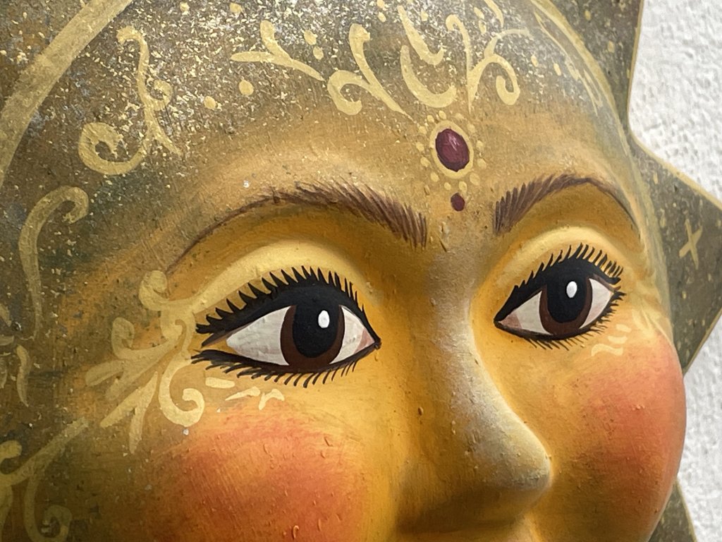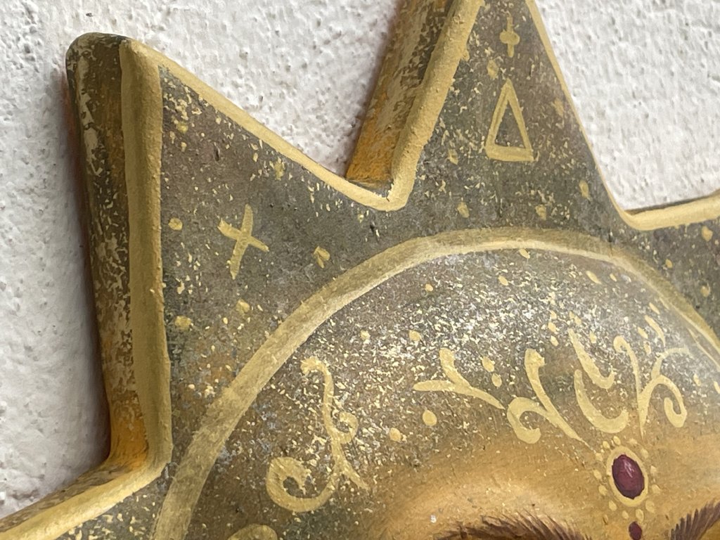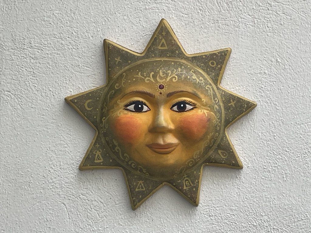 Ručně malované keramické slunce o průměru 32 cm, zdobené symboly na paprscích a jemným třetím okem na čele. Výrazná dekorace, která do prostoru přináší klid, světlo a pocit ochrany.