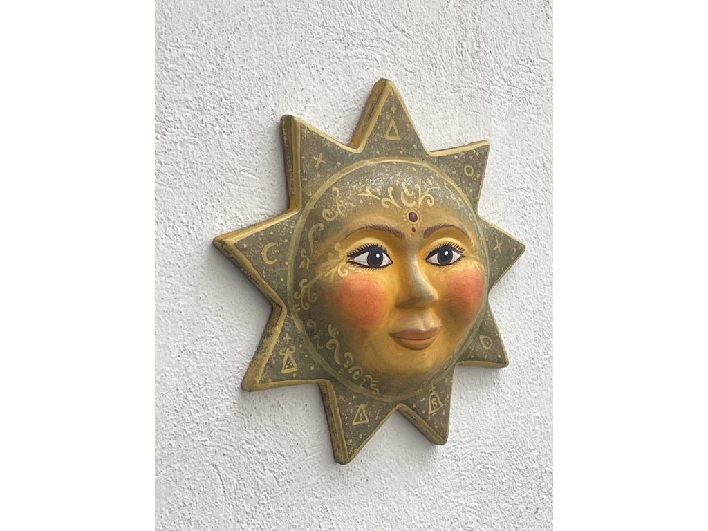 Barevnost v teplých tónech okru, zlata a jemné patiny dodává slunci hloubku a lehce starosvětský charakter. Díky průměru 32 cm se jedná o výrazný solitér, který vynikne na stěně interiéru, na chalupě i v krytém venkovním prostoru.