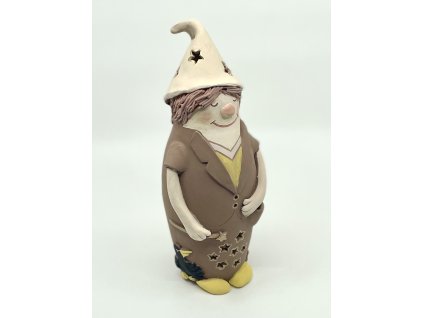 Přírodní neposedný skřítek Eliášek – originální keramická dekorace na svíčku s kouzelnou atmosférou. Dekorace určená na svíčku, z bezpečnostního hlediska doporučujeme elektrické napodobeniny svíček. Velikost sošky skřítka je +/- 23 cm