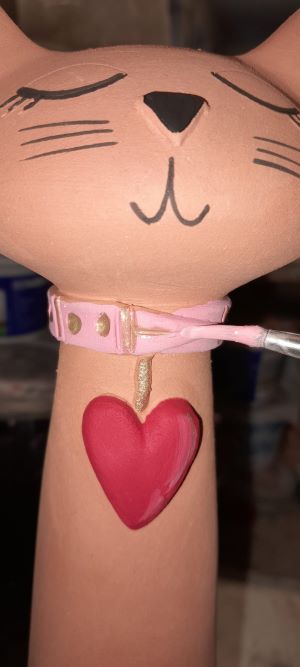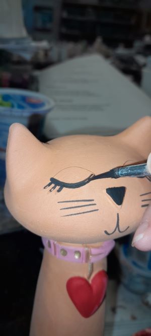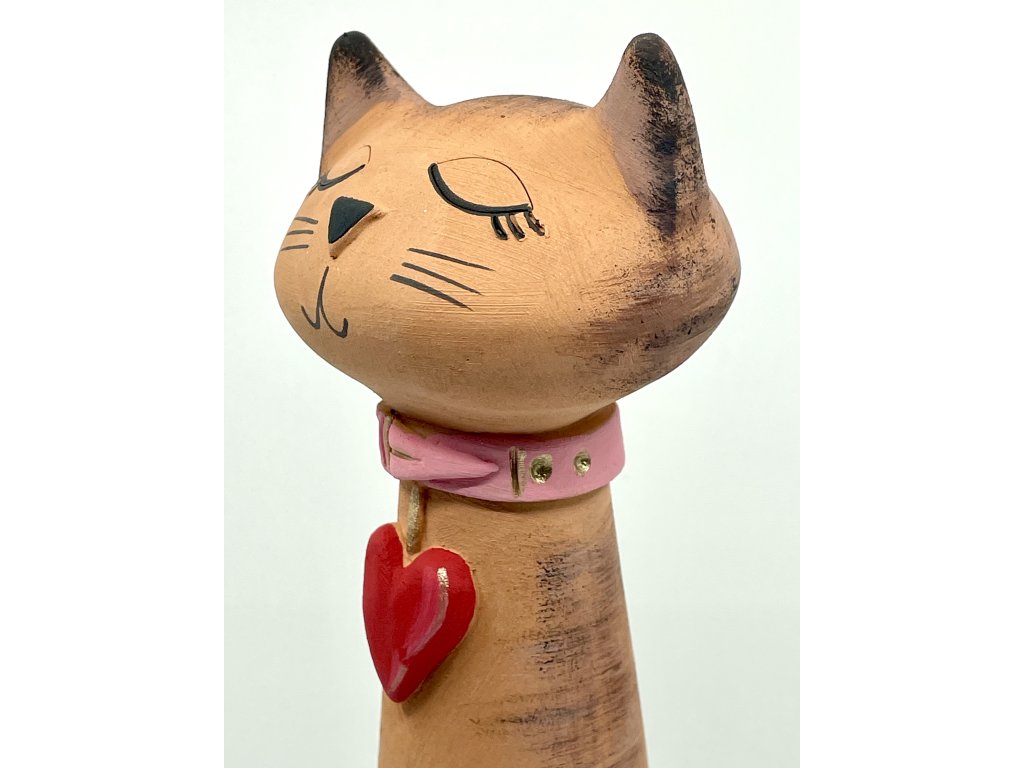Zavřené oči symbolizují vnitřní klid a důvěru, stočený ocas eleganci a ženskost. Červené keramické srdce, zavěšené na krku, je výrazným detailem – připomíná, že i ta nejdivočejší kočka má své něžné místo.